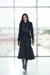 El delantero es visible y se une de forma limpia con discretos corchetes metálicos, creando una silueta impecable y muy fluida que favorece la figura. La verdadera joya reside en su bordado intrincado en plata, que simula delicadas hojas, adornándolo con un arte excepcional y una distinción única.